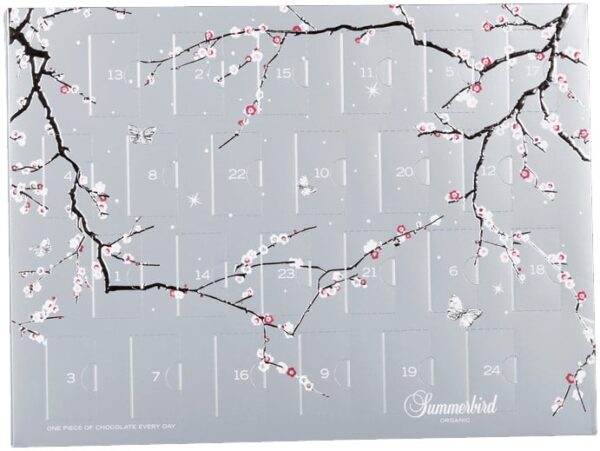 Årets klassiske julekalender med sølvmotiv er inspireret af det ikoniske tapet, som dekorerer alle Summerbird-Chocolaterier. Julekalenderen indeholder både de smagfulde chokoladebarer og elegante, fyldte chokolader.