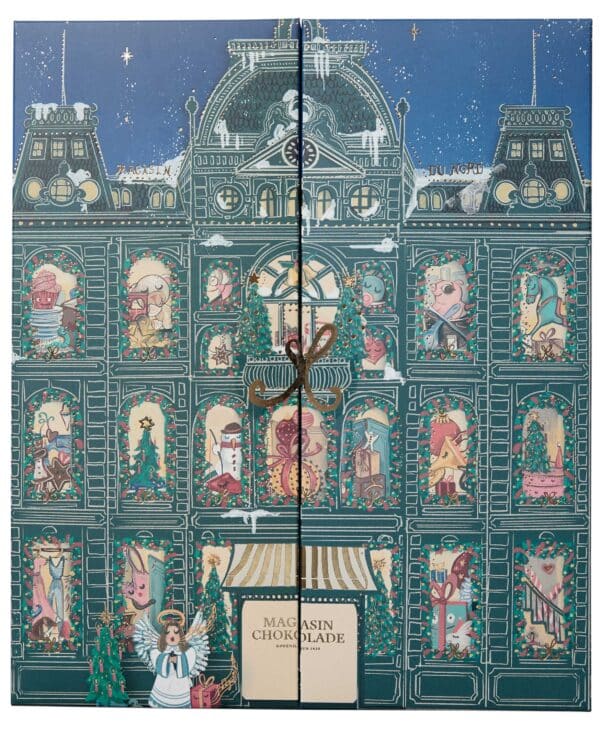 Julekalender fra Magasin du Nord til hele julen. Julekalenderen indeholder 24 låger. Chokoladerne er massive med 4 forskellige smage i hvid, mørk og mælkechokolade med små smagsoverraskelser. Forkæl dig selv eller en du har kær med den smukke julekalender